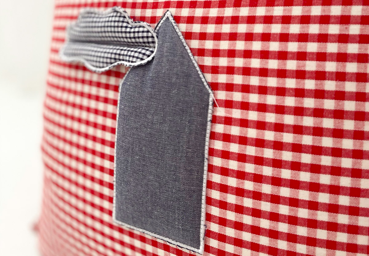 Casetta e nuvoletta, applicate e ricamate sul cuscino, disegnano un paesaggio poetico e familiare, rassicurante come un rifugio segreto.